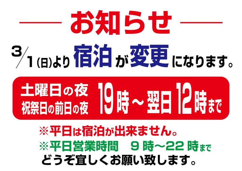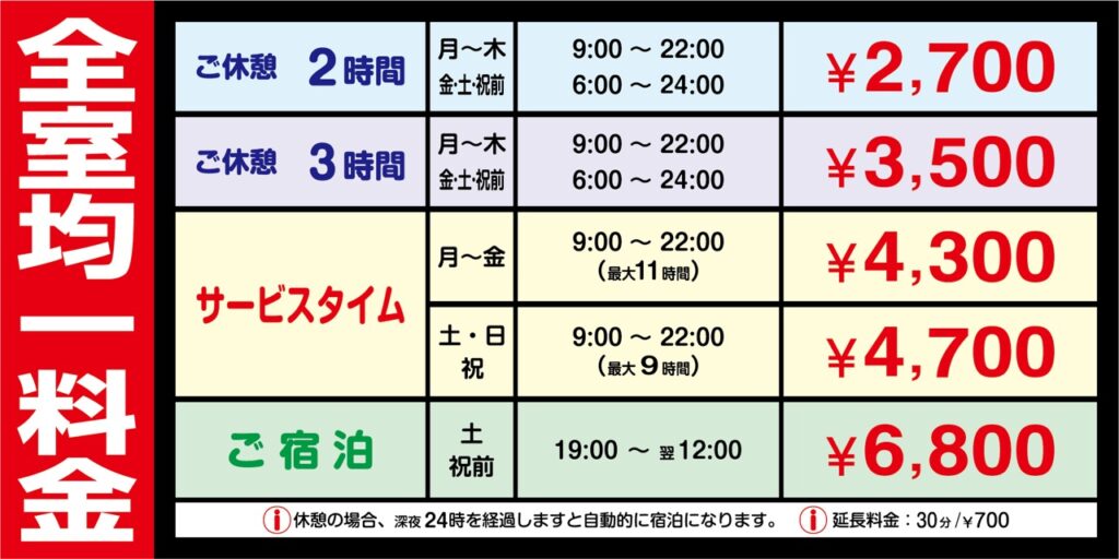 | お支払い方法 | 各部屋自動精算機にてお支払い (クレジットカードのご利用は準備中) |